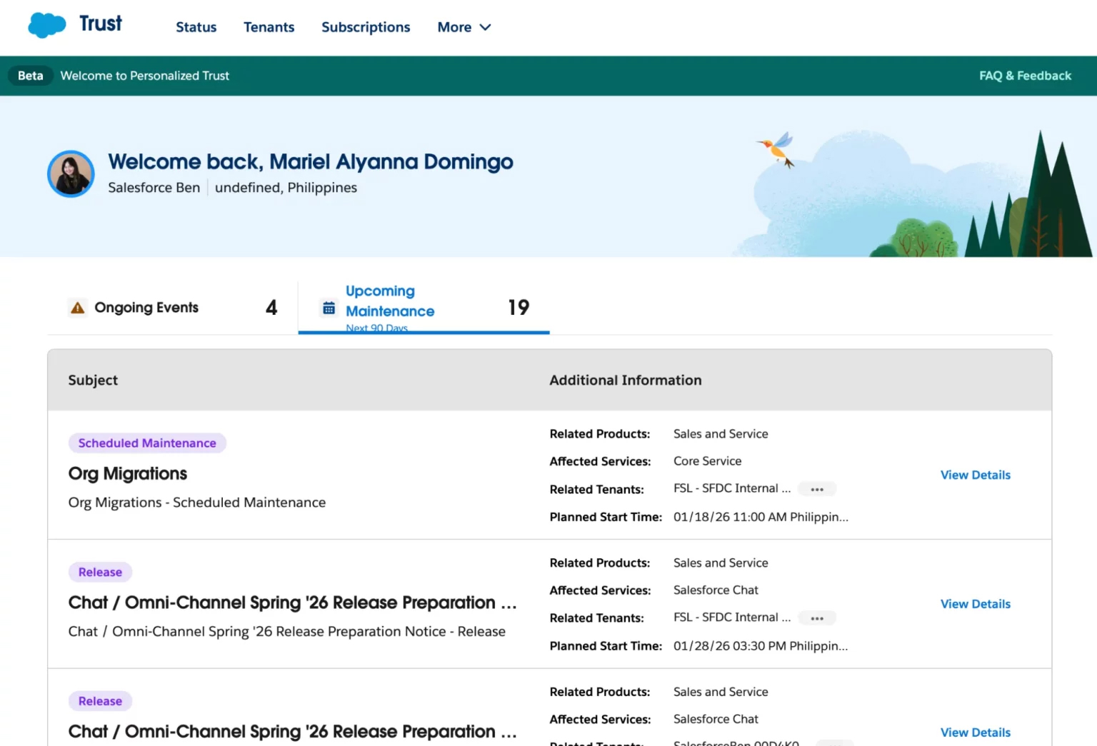 “个性化信任”现已更名为“我的信任中心”!您可以把它想象成 salesforce trust 网站,只不过这里展示的都是与您相关的信息。